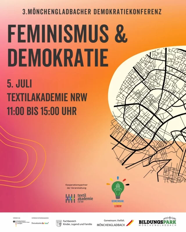 Die Partnerschaft für Demokratie Mönchengladbach wird ermöglicht durch das Bundesprogramm „Demokratie leben!“. Seit 2015 unterstützt das Bundesministerium für Familie, Senioren, Frauen und Jugend im Rahmen des Bundesprogramms „Demokratie leben!“ die Zivilgesellschaft in ihrem Engagement für ein vielfältiges, gewaltfreies und demokratisches Miteinander. Dabei werden kommunale, regionale und überregionale Projekte gefördert, die sich in der Demokratieförderung und der Extremismusprävention engagieren. Die Kernziele von „Demokratie leben!“ sind „Demokratie fördern. Vielfalt gestalten. Extremismus vorbeugen“.